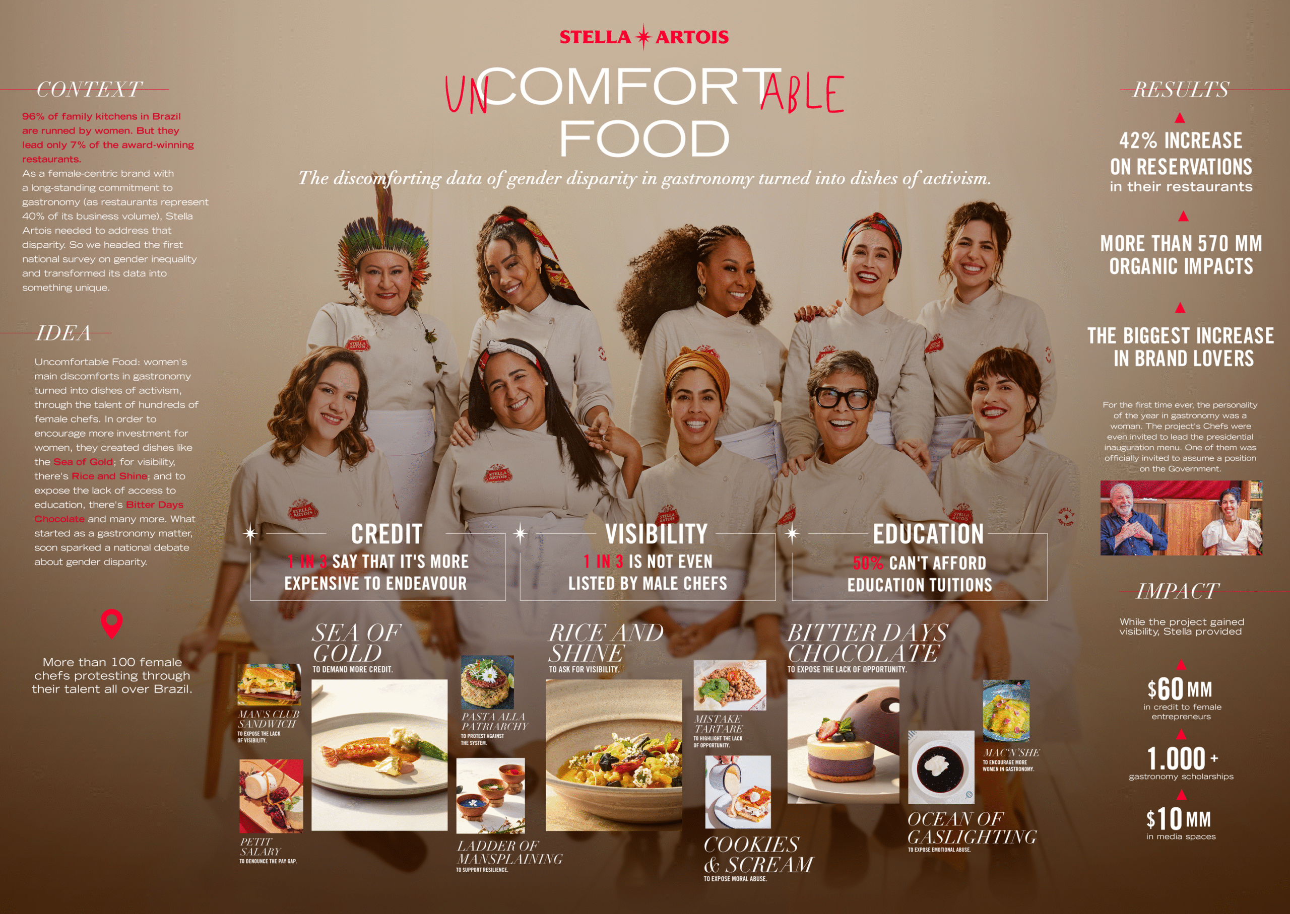 Essa disparidade chamou a atenção da Stella Artois, que, em parceria com chefs de todo o Brasil, lança um cardápio que transforma os desconfortos vivenciados por mulheres na gastronomia em pratos originais. Uncomfortable Food: uma iniciativa para tirar a gastronomia da zona de conforto. art director graphic design
